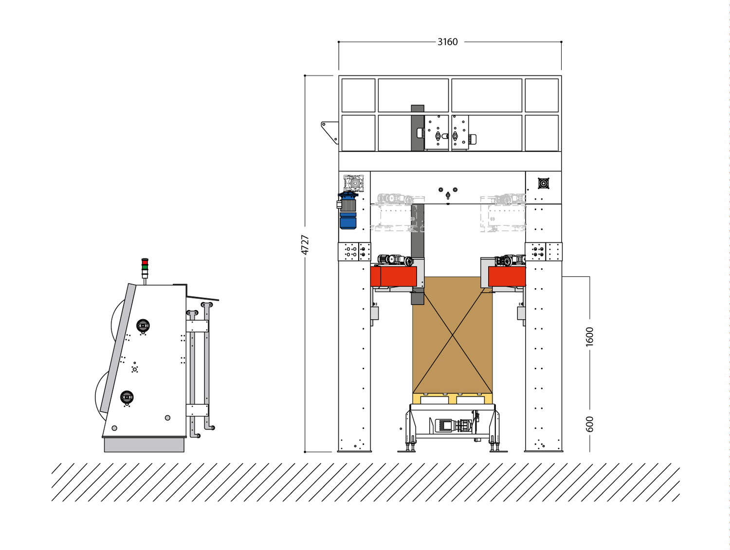 • The hooding arc descends, applying the tensioned hood over the product down to the base of the pallet.
