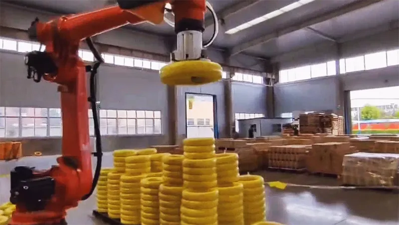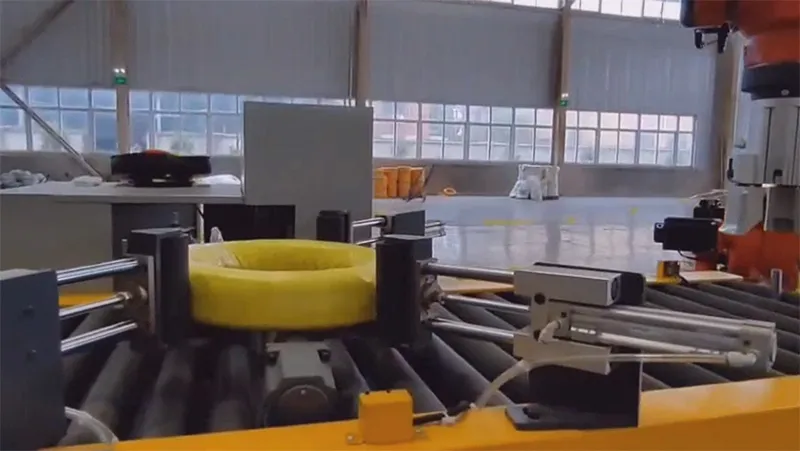 The SA-WS-25 facilitates a streamlined packaging workflow. Coils are manually fed into the machine, where the automatic horizontal wrapping process takes place. Once wrapped, a robotic arm performs the unloading, placing the finished coil for the next step in the logistics chain, typically onto a pallet. The horizontal configuration not only enhances stability but also simplifies the integration of manual feeding and robotic unloading.