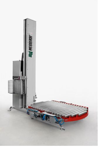 Movement of pallets onto and off the rotating table is facilitated by integrated motorized rollers or chain conveyors. This design makes the SH-TA ideal for integration into automated conveyor lines, allowing pallets to flow seamlessly through the wrapping station. The machine's control system manages the speed of the rotating table and the reel bearer, allowing optimization of the wrapping process for different load types and desired film coverage.